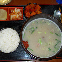 ■ ソルロンタンを食す ■ 「最後は、ソルロンタンで締めるよーっ!」 飛行機出発の19時まで暇なので 食堂でソルロンタンを食べる。 うっ・・・流石は空港プライス、6500W(650円)也。 ■ オマケ ■ ソルロンタンとは、牛骨や内臓を煮込んだスープ。 具に、赤身のお肉(ハムみたいな奴)と麺が入っている 味が薄いので、好みで塩やコチュジャンを足して喰うべし! これぞ、コラーゲン濃縮スープやね〜 |