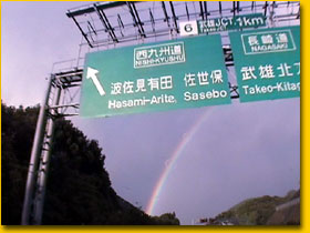 しかも、それが夕方、西日を背に受け、高速道を東に向けて走っていたので、ずーっと視界の目の前に浮かびつづけている。 文字通り、虹に向かって走りつづけたのです。こんな体験はあんまり出来ないだろうナァ。